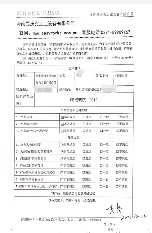 當(dāng)月呼和浩特中燃公司收到易沃克PE管鍘刀后立即開始現(xiàn)場(chǎng)燃?xì)釶E管切割搶修現(xiàn)場(chǎng),現(xiàn)場(chǎng)工人師傅反饋使用后贊不絕口,這個(gè)易沃克廠家的PE管鍘刀質(zhì)量和效率真不錯(cuò),十多分鐘就可以帶氣切割大大提供現(xiàn)場(chǎng)搶修PE管切割時(shí)間,而且燃?xì)夤艿缼釶E管切割操作,現(xiàn)場(chǎng)師傅說前幾年一直用的美國(guó)進(jìn)口PE管鍘刀,想不到我們國(guó)產(chǎn)易沃克PE管鍘刀效果這樣好我們易沃克廠家的售后服務(wù)團(tuán)隊(duì)跟蹤一直在跟進(jìn)使用效果以及現(xiàn)場(chǎng)視頻免費(fèi)技術(shù)指導(dǎo),下面是燃?xì)夤艿垃F(xiàn)場(chǎng)PE管鍘刀使用效果反饋圖 和售后的服務(wù)評(píng)價(jià)表